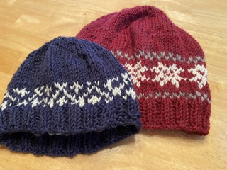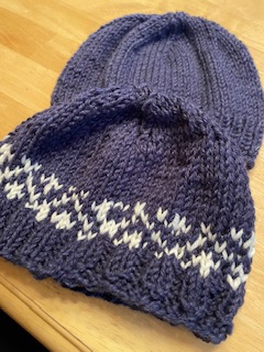 Produktionen är i full gång och den blåa mössan med vitt mönster fick sin början på eftermiddagen och så avmaskade jag efter middagen. Att sticka en babymössa tar inte länge, ca. 3 h. Däremellan hade vi ätit väldigt god, grillad korv med ugnsbakad potatis och grillade jalapeños fyllda med Neufchâtel ost plus att jag hade hunnit baka en hel sats med kakor.