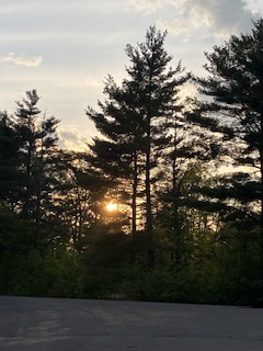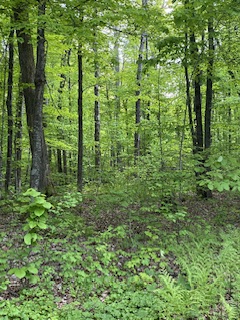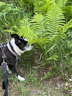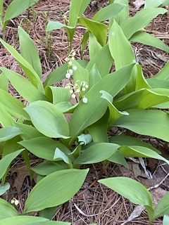 Ormbunkarna utefter vägen som leder till vår stuga har slagit ut så fint och helt klart fanns det mycket att nosa på som ni ser. Inne i skogen utefter vägen har vi sett vitsvanshjorten både en och två ggr. Maken har till och med sett en björnmamma med unge en gång, men dem vill man inte komma för nära! Denna kväll var det dock alldeles tomt i skogen, men så vackert med den härliga grönskan. På vår tomt här vid stugan har liljekonvaljerna ( Lily of the Valley på engelska) lite smått börjat blomma.