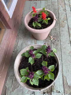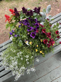 Det blev lite av varje i år. Jag undvek de vanligaste och enklaste som jag alltid planterar, petuniorna. Det blev bla salvia, det blev ngt som kallas Super Bells och de vita gräskliknande blommorna kallas White Knight. Har man stuga mitt i en skog vid en sjö får man vara beredd på sabotage av smågnagare. Detta hände förra sommaren och jag gissar nog att det kommer att saboteras i sommar igen av våra ständiga grannar, jordekorrarna. ( Piff och Puff ni vet.)