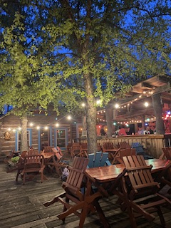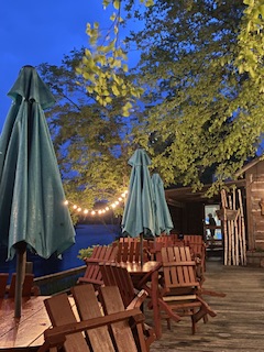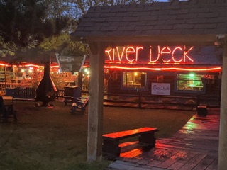 På kvällen blev det utemiddag på resturang. Riktigt bokstavligen utomhus satt vi under parasoll som skyddade lika bra från regnet som mot solen. River Deck är ett mysigt ställe och här har vi ätit förut och kommer att äta igen i sommar. En sommar restaurang som har öppet endast på sommaren. Vi hade träff med en av Makens kollegor och henens Make som har stuga lite längre bort från oss. Det blev en trevlig kväll, trots kylan och regnet….