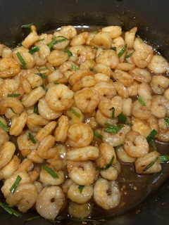 Maken hade flyglektion sent och Lillasyster besökte hela fem studentfester, så ingen av dem var hemma vid normal middagstid. Jag förberedde middagen och så åt Maken och jag tillsammmans en sen måltid när han kom hem vid 19.30 tiden. Jag gjorde denna enkla, men väldigt goda rätt på marinerade och stekta räkor. Marinaden består av honung, sojasås, färsk, riven ingefära och en pressad vitlöksklyfta. Marinera räkorna en halvtimme till en timme i 3-4 matskedar av marinaden. Till resten av den marinaden/såsen läggs 1 tesked potatismjöl. Stek räkorna med marinaden i stekpanna till genomstekta. Tillsätt gräslök/salladslök och resten av marinaden med tillsatt potatismjöl. Låt allting sjuda upp några minuter och servera över kokt ris. Enkelt och mycket gott.