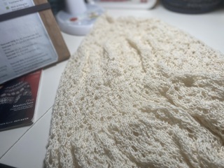 Jag är inte helt nöjd med sjalen. Spetsen ser inte riktigt ut som den borde…. Däremot är det svårt att se hur den kommer att se ut när den är klar och vecklas ut. Jag har nästan 300 maskor på stickan och i de 2 nystan som jag hittills använt finns det sammanlagt 800 m garn!