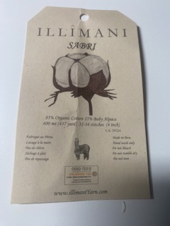 Garnet är tunt och väldigt ,ljust. . Jag kom ihåg att det var linne garn, men när jag sökte fram etiketten till garnet, visade det sig att garnet är spunnet av 85% ekologisk bomull och 15% baby alpacka. Inte undra på att det är mjukt! ( Nedan ses etiketten för garnet.)