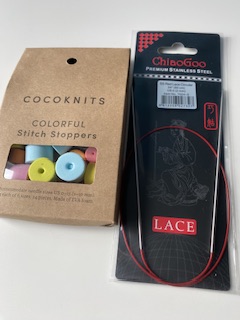 Besöket vid garnaffären gick väldigt snabbt och hem kom jag helt utan garn, men med en ny rundsticka ämnad för spets och små stoppare eller vad man skall kalla dessa att lägga på ändorna av stickan så att maskorna hålls på plats.