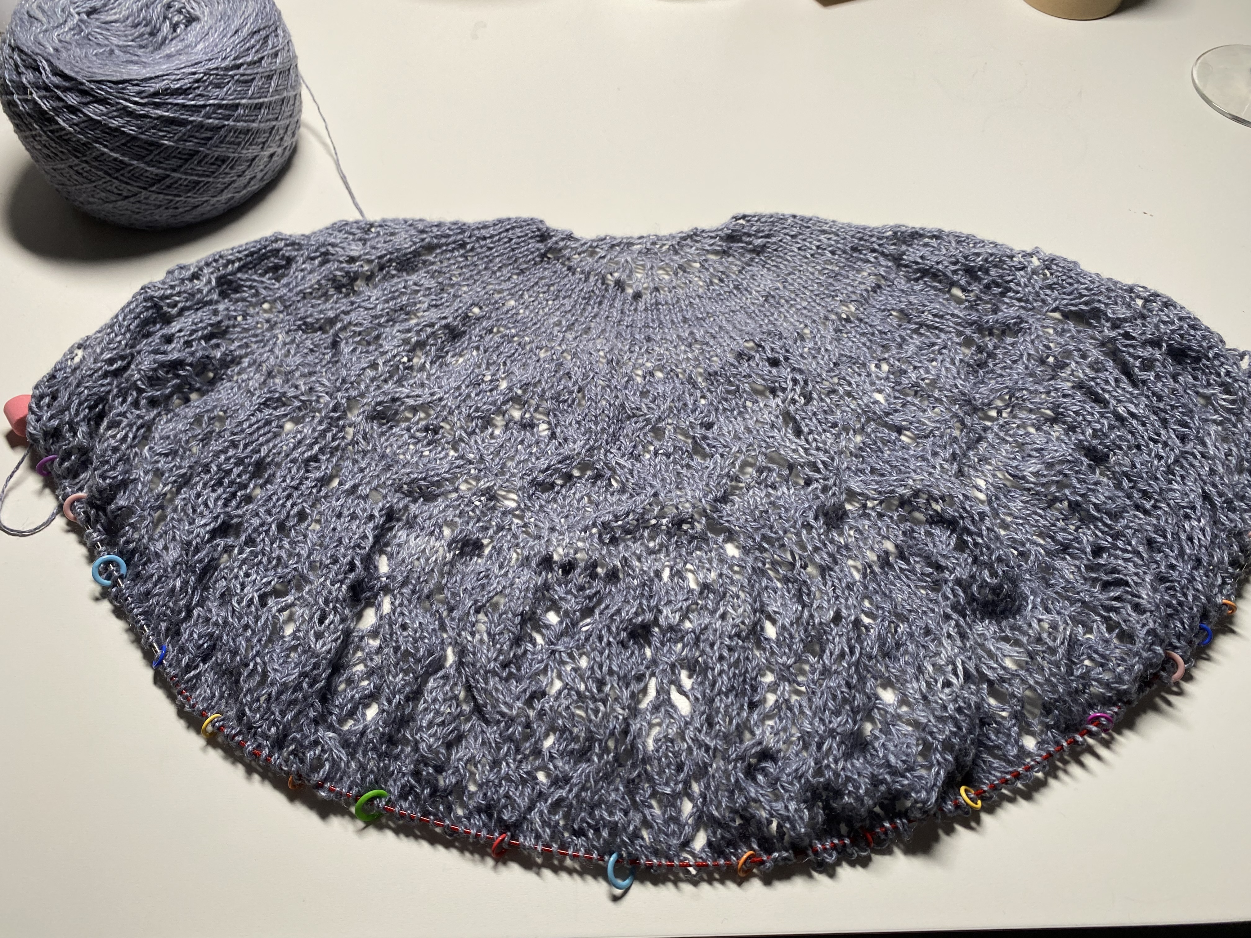 Med dessa stoppare i ändorna på stickan är det också lättare att visa upp mitt senaste projekt. Just nu har jag 195 maskor på stickan och är halvvägs igenom det andra utav fyra mönster. Denna sjal kommer jag att sticka ngt mindre än den första som blev klar tidigare i veckan. Ett varv går märkbart mycket snabbare nu med projektet flyttat till en bättre sticka ämnad för spets. Den första sjalen i naturvitt tog 6 veckor. Gissar denna tar ungefär lika länge, eftersom detta inte är ngt projekt som jag kan pyssla med med ngn sittandes bredvid mig. Det måste vara absolut tyst, och så sitter jag vid ett bord rakt framför mönstret.