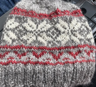 … hemåt Minnesota och Förorten under seneftermiddagen, stickade jag klart mössan som jag började med i fredags. Detta var mönstret som jag använde på en av de allra första mössorna när jag först började sticka mönster för ett och ett halvt år sedan. Nu jag ville testa det igen. Jag kan säga som så…. Jag har lärt mig en del! Mössan är stickad i grått alpacka garn medan både det röda och det vita var restgarner. Alpacka är så väldigt mjukt att sticka i och jag hoppas mössan blir varm i vinter för Maken som gärna ville ha den.