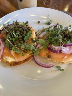Efter gudstjänsten gick färden vidare i värmen. Denna gång till ett mysig café som också mera eller mindre hör till under våra besök. Maken och jag bestämde oss för att dela laxsmörgåsen. Också denna en favorit.
