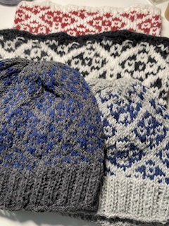 På bilden till vänster ses den färdiga halsvärmaren som jag maskade av vid 19 tiden ikväll. Sedan grävde jag bland färdigstickade projekt och hittade en del annat med samma mönster…! Två mössor och en till halsvärmare! Mönstret är inte svårt, går fort att sticka och blir snyggt i olika färger. Så jag gissar att det så småningom blir flera mössor, eller vantar eller…? ( Om jag inte var bosatt så långt hemifrån kanske jag satte igång med ngn slags utlottning om det fanns intresserade…?!)