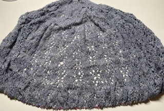 Efter några dagars uppehåll från den rätt invecklade och nu stora spetssjalen, tog jag mig åter an projektet ikväll. Det tar sin lilla tid att bara sticka ett varv och jag fick tre gjorda ikväll. Jag tog inte tid precis, men runt en och en halv timme gissar jag att dessa tre varv tog. På bilden ser den åter blygrå ut, men den är i verkligheten mycket mera gråblå än blygrå.
