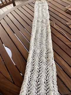 Innan middagen satt jag ute och jobbade på min vita spetshalsduk och jag tänker att det börjar närma sig avmaskningen….