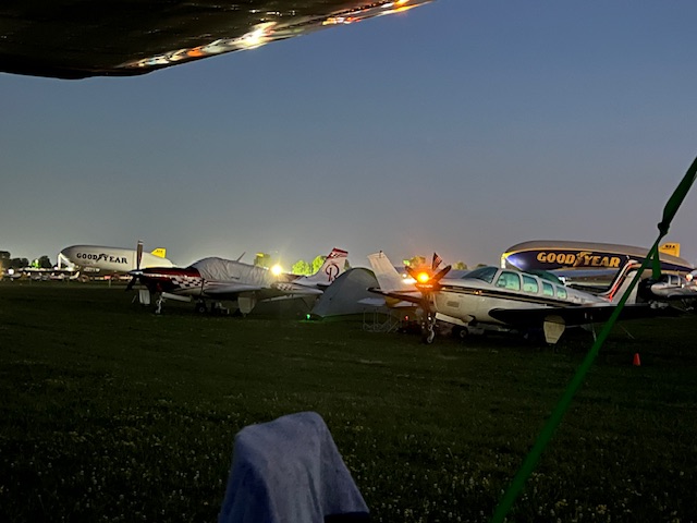 Natten sänker sig över zeppelinarna, flygplanen och tälten på flygmässan i OshKosh…. ( Maken tog och skickade bilden)