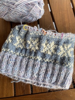 Det trevliga med ylle är ju att det andas. Det klibbar inte fast som tex konstgarn , så det går faktiskt bra att sticka med även i varma förhållanden. Åtminstone små projekt som mössor och sockor där inget draperar över en där man sitter.