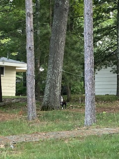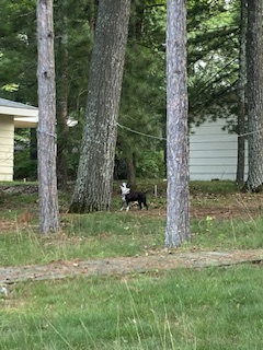 Det är svårt att se hunden Fiona där på marken eftersom jag tog bilderna från stranden. Hon gör däremot sitt allra bästa för att klättra upp till ekorren i tallen ovanför henne. Den satt alldeles ovanför henne. Stilla och svängde på svansen. Ungefär som för att retas. Sedan klättrade den högre och fortsatte med detta en stund till medan Fiona hoppade och skuttade som en liten kanin. Som bekant är hundar inga klätterapor, så Fiona fick snällt hålla sig på marken och stirra uppåt.