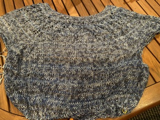 Efter det långa samtalet, jobbade jag vidare på den stickade toppen i bomull…. Det finns en del misstag, så vi får se hur det hela (ur)artar sig… Men jag lär ju inte lära mig om jag inte testar tänker jag….
