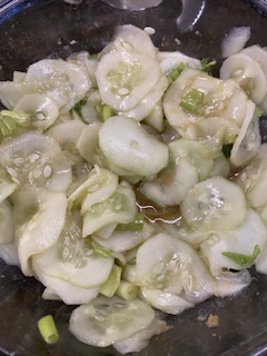 Jag testade även ett nytt recept ikväll. Vi fick ju så många färska gurkor utav grannen, så jag testade en ny sallad på färsk, skivad gurka, cilantro och salladslök. Först saltas den tunt skivade gurkan rejält och rörs om. Den fick stå i ett durkslag och rinna av sig i 15 minuter medan jag gjorde den asiatiskt inspirerade dressingen. Den bestod av: