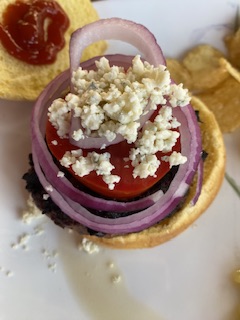 Jag hade blåmögelost i kylskåpet som behövde användas och den smakade alldeles utmärkt på den grillade biffen. Lökringar och tomat är för mig ett måste på hemgjorda hamburgare, men man kan ju sätta allt möjligt gott på dessa: ostskivor, salladsblad, andra grönsaker etc.