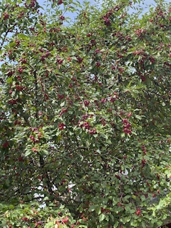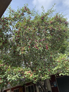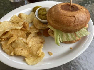 Till höger min utsökta smörgås med grillat kycklingbröst, salladsblad, lök, tomatskiva och skivade jalapeños. Den var verkligen god! Kettle chips serverades till och de är ju verkligen så goda de med. Vi valde ett bord utomhus på den lilla terrassen och till vänster och i mitten ses det enorma äppelträdet i bild. Alldeles fullt med röda, små äpplen. DessA kallas crab apple trees på engelska och har vackra blommor redan på försommaren. Och maten var ännu bättre än vad den burkade vara, så det lär bli flera besök inom snar framtid.