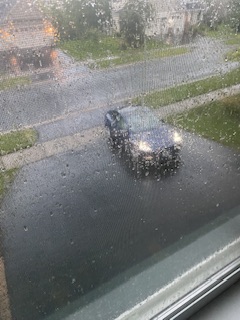 På bilden ovan ses hon köra iväg till harplektionen i ösregnet istället för skolan. Vi vaknade till mulet väder, men vid 08.30 tiden öppnade sig himlarna och regnet vräkte ner. åskan dundrade till synes alldeles ovanför vårt hem och blixtarna avlöste varandra. Till all lycka är det nu i allmänhet för svalt för tromber att utvecklas, så några väderssirener tjöt inte denna morgon.