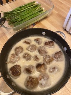 Följaktligen blev det också ngt som vi hos oss kallar vintermat till middag. Köttbullar med brunsås, ugnsbakad sparris och så en potatismos, som jag inte fick med på bilden. Det blev riktigt gott måste jag få säga och vi hade även lingonsylt i skafferiet, vilket faktiskt finns i affärerna här.