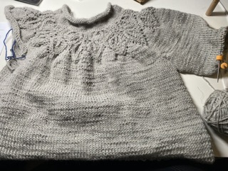 Den gråa ulltröjan framskrider och nu är den vänstra ärmen påbörjad. Jag har avmaskat huvuddelen och provade tröjan innan jag började med första ärmen. Den passar oerhört bra och jag är mycket, mycket nöjd. Så passa nöjd att jag kanske…