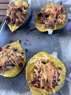 Dessa squash tar länge att koka mjuka i ungen. Vanligtvis, för att spara tid, kokar jag dem mjuka i mikrougnen, vilket endast tar 10 minuter. Fyllningen är en slags korv som ser ut som malen nötfärs, men smakar annorlunda. Denna korv steker jag med hackad lök, peppar och salt. När den är genomstekt sätter jag till stötbröd/skorpsmulor, torkade tranbär och ett ägg. Blandar ihop allt väl och fyller sedan squashen. Sedan strör jag riven ost på och så gräddas maträtten i ungen ca. 20 minuter. Enkelt, mättande och riktigt gott.