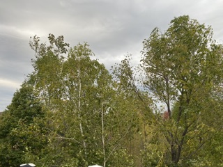 Det är ju inte precis lätt att visa vind, men jag försökte i alla fall få de svajande trädkronorna på bild i eftermiddags. Som ni ser är det rätt grönt i träden ännu,, men vissa träd har börjat visa sin vackra höstskrud. Däremot inte så mycket bakom vårt hem som ni ser.