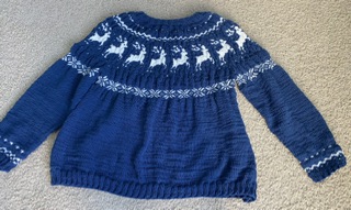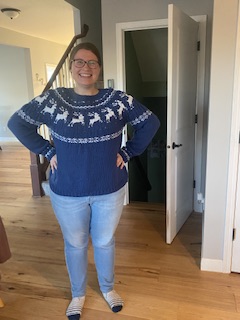 I mitten på oktober, innan min resa till Kanada, började jag på denna ylletröja. Den skulle bli en tidig julklapp till Dottern, men eftersom hon alltsom oftast tar sig en titt på vad mor i huset plitar ner, kunde jag ju inte skriva om detta stickprojekt. Till höger ses Lillasyster som agerar mannekäng.