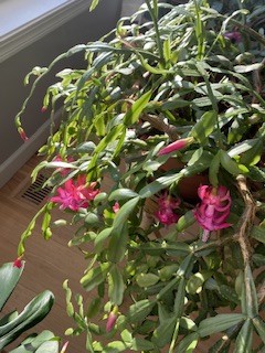 Julkaktusen fortsätter blomma och fin är den! Den riktigt sträcker sig mot ljuset i fönstret där den står. Små, nya skott kommer dessutom upp mitt inne i blomman, plus att den ideligen får nya knoppar, så helt missnöjd kan den inte vara.