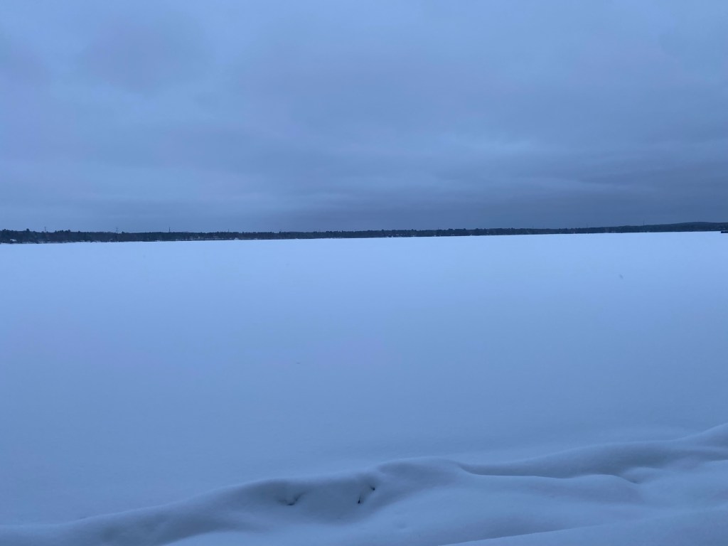 Efter att jag skottat klart var jag varm i kroppen och rödrosig om kinderna. Spaden sattes åt sidan och jag pulsade genom snön ner till den frusna sjön. En och annan snöskoter färdades över isen, men annars var det lugnt och stilla. Bilden ovan tog jag vid 16 tiden och det hade börjat skymma åter.