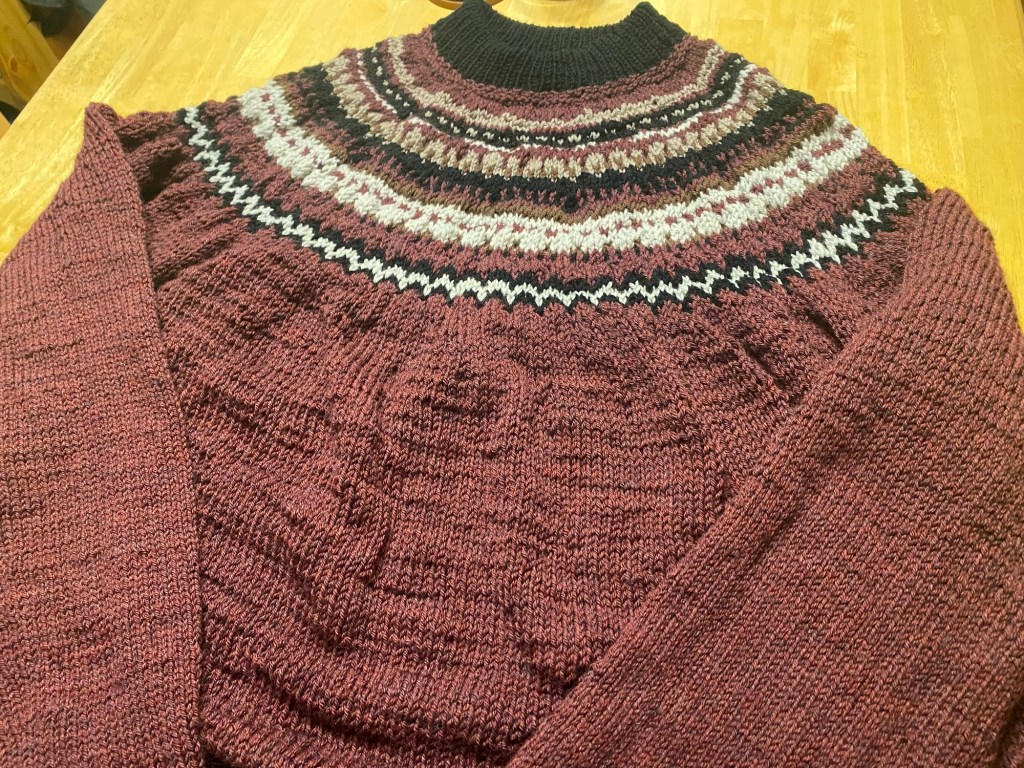 Jag hade nämligen ägnat den större delen av dagen åt att sticka klart Makens tröja. Det tog sin lilla tid att sticka halsringningem på 8 cm. Sedan skulle den vikas dubbel och sys fast. En miljon ( kändes det som) trådar skulle fästas och ärmhålen skulle sys fast.