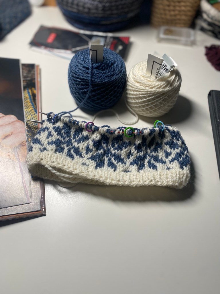 … stickade jag under eftermiddagens bilfärd hem till Förorten igen. Det är rätt ovanligt egentligen, men eftersom jag började med ett mindre projekt på lördagskvällen och behöver läsa mönstret på samma gång jag stickar, är det helt enkelt lättare att låta stickningen vila i väskan under bilfärden.