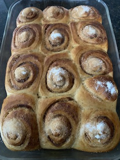 … som dagens lilla sats med kanelbullar jäste, satte jag mig i soffan med stickningen. Den nya blålila tröjan. Lillasyster, som stannade hemma från skolan idag, eftersom vi båda delar samma förkylning för närvarande, bad mig att göra en sats kanelbullar. Det tar ungefär lika länge att göra kanelbullar en bröd/bakmaskin, som för hand, men maskinen gör ju jobbet med degen. . Det blir 12-15 bullar per gång, vilket inte är många precis, men räcker faktiskt bra för tre personer. Som ni ser av bilden har jag fortfarande inte hittat ngt pärlsocker, så för tillfället är det strösocker som gäller.