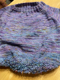Toppen blir mera lila än jag hade tänkt mig med det melererade garnet. Hade nog gärna sett mera blått. Jag kom en bit på spetskanten nertill nu under kvällen. Jag har följt mönstret till punkt och pricka, men jag kan inte påstå att min kreation ser ut som bilden på mönstret precis…. Vilket är lite synd, för jag gillade verkligen det mönstret. Nu är är jag ju inte klar än och förhoppningsvis blir det bra ändå.