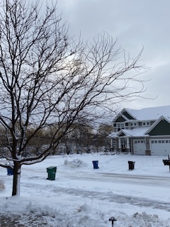 Så ser det åter ut så här hos oss. Vintern kom naturligtvis tillbaka. Ngt annat borde man ju nog inte vänta sig i februari…egentligen. ( det är skräpkärl som syns på bilden. Utsatta på torsdagen på vår gata eftersom de töms den dagen.)