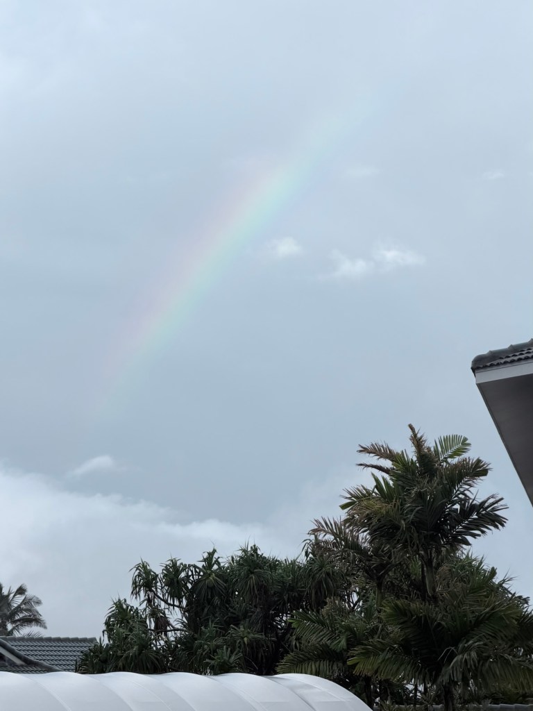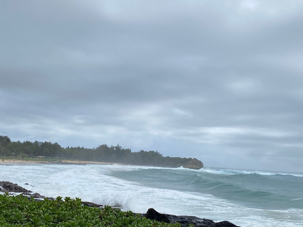 Den observanta läsaren har förstått att jag kommit längre i stickningen än det jag rev upp, eller ’stickade baklänges’. Vilket i sin tur betyder att det åter har regnat sgs hela dagen här på Kauai. Det har funnits bra med tid för stickning med andra ord.