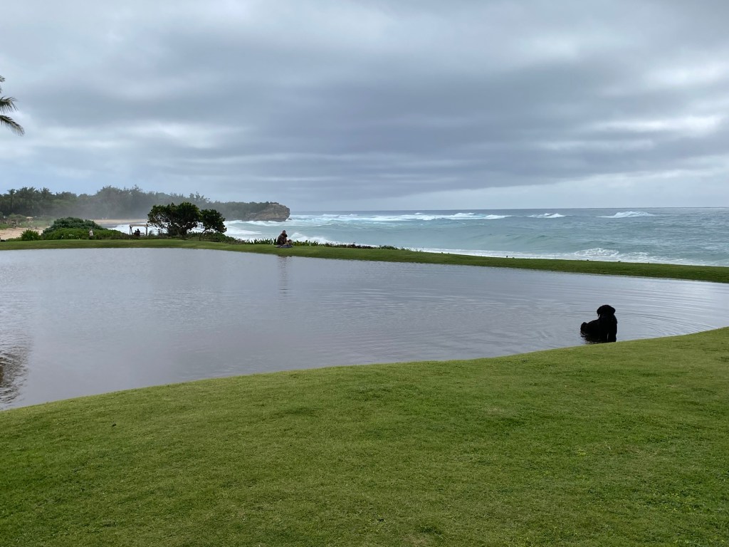 Nära hotellet, på väg till stranden finns nu en stor sjö. När Maken och jag gick förbi i förmiddags badade en stor hund i sjön. Vattnet gick ända upp över hundens framben och upp till bringan på den. Anmärkas skall att denna sjö inte existerade för ett dygn sedan…