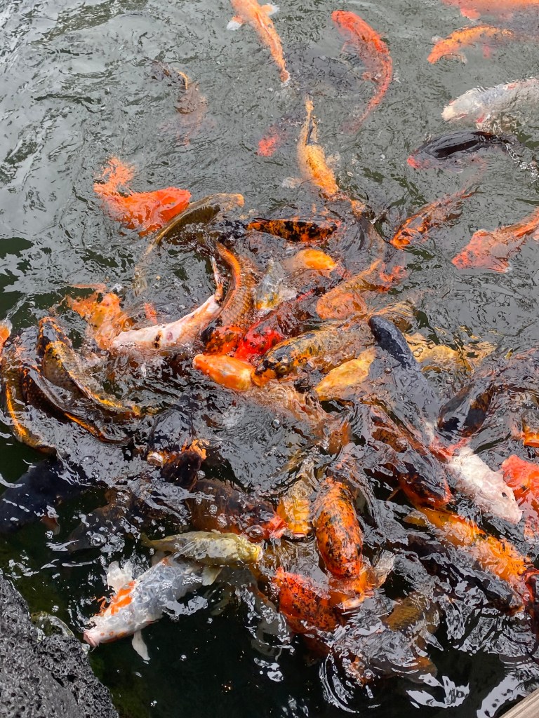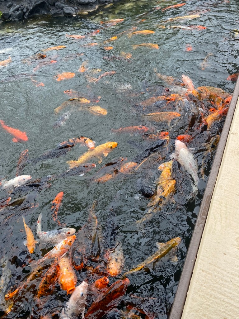 Maken och jag kom oss ut på en rask promenad i morse medan regnet erbjöd ett kort uppehåll. Vi stannade upp vid hotellet bredvid vårt och matade Koi, eller guld fiskarna. Fiskmat erbjuds i små papperspåsar i en liten låda nära fiskdammen. Bara för besökare att förse sig själva. Maken tog en påse ur lådan medan vi stod under tak och väntade på att regnet, som åter hade börjat, antingen skulle upphöra eller lugna ner sig en smula.