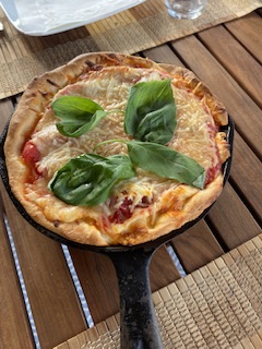 En halvtimme i ugnen och sedan fick vi slå oss till bords ute på verandan för första gången denna säsong. Visserligen med stängda fönster, ute blåste det och var +13, men ändå.