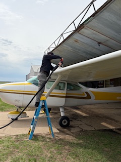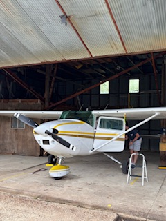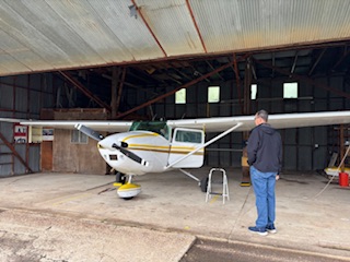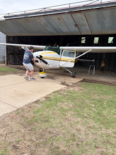 Vi anlände vid hangaren runt 12.15 och efter en noggrann men blixtsnabb översyn och tankning av det lilla flygplanet, satte sig Sonen framför spakarna och kort därefter var de unga tu åter i luften!